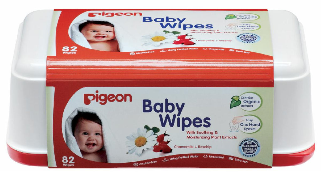 Baby wipes by Pigeon with chamomile & rose hip and organic extract are safe on baby's tender skin.